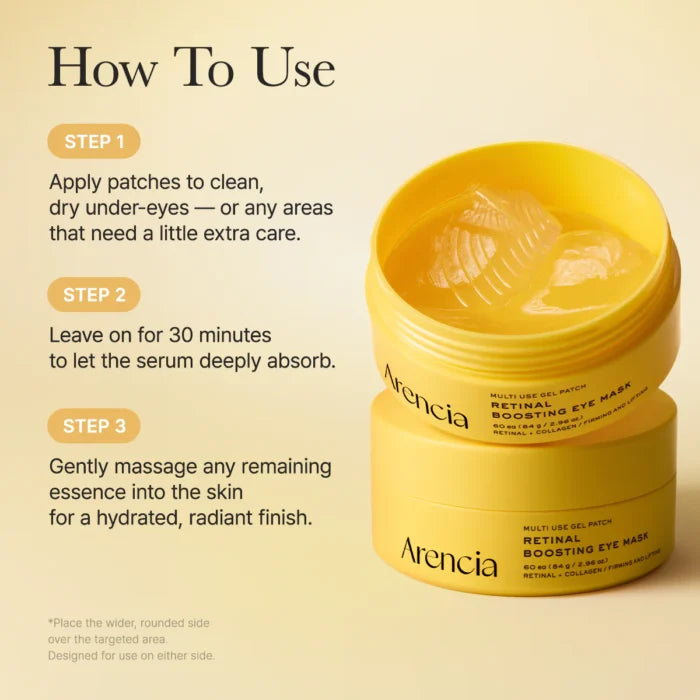 Pair the Retinal Boosting Eye Mask with other Arencia Beauty Products such as serums or moisturisers to create a complete Korean skincare routine that targets hydration, elasticity, and overall skin balance.
